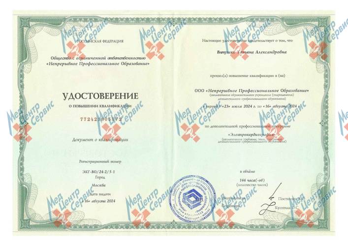 | 2024 г. | Повышение квалификации по дополнительной профессиональной программе «Электрокардиография». ООО «Непрерывное Профессиональное Образование» |