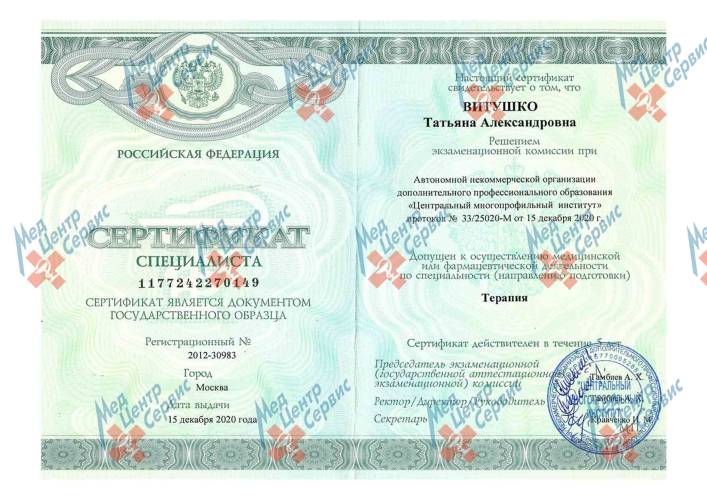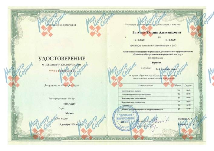| 2020 г. | Повышение квалификации по специальности «Терапия». АНО ДПО «Центральный многопрофильный институт» |