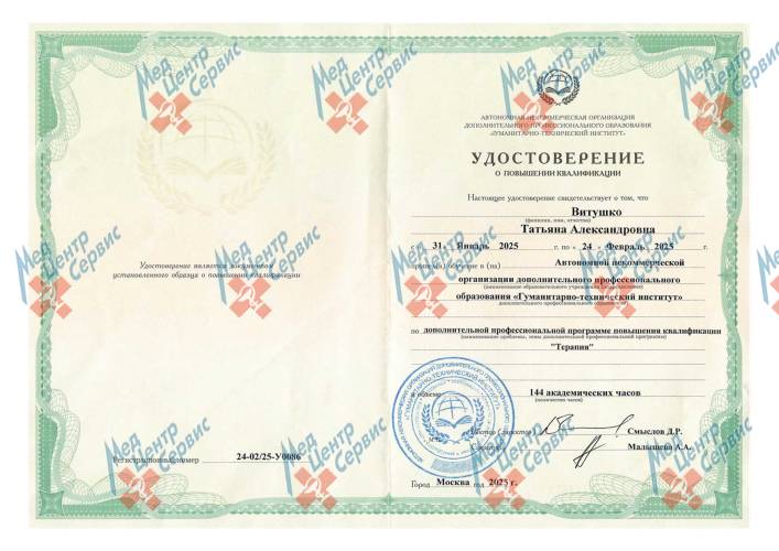 | 2025 г. | Повышение квалификации по дополнительной профессиональной программе «Терапия». АНО ДПО «Гуманитарно-технический институт» |