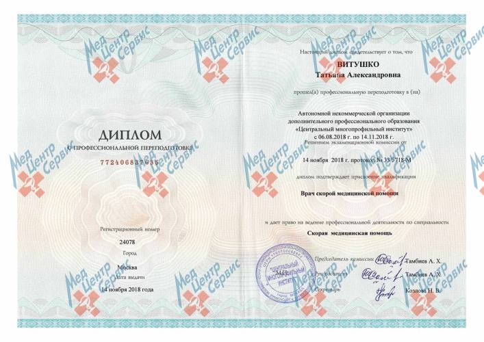 | 2018 г. | Профессиональная переподготовка по направлению «Скорая медицинская помощь», специальность «Врач скорой медицинской помощи». АНО ДПО «Центральный многопрофильный институт» |