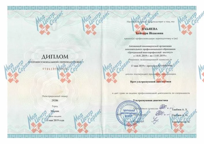 2019 г. | Профессиональная переподготовка по специальности «Ультразвуковая диагностика». АНО ДПО «Центральный многопрофильный институт» |