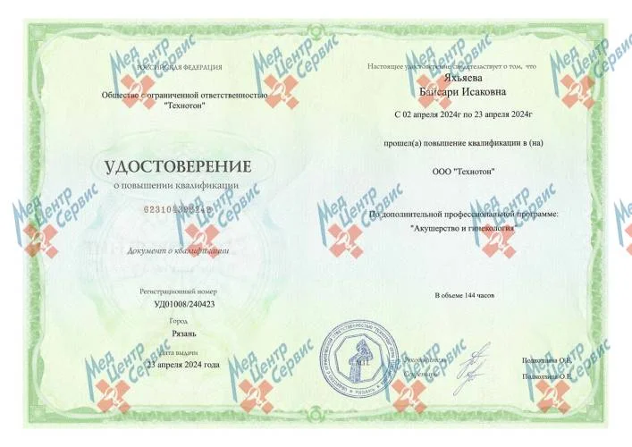 2024 г. | Повышение квалификации по дополнительной профессиональной программе «Акушерство и гинекология». ООО «Технотон» |