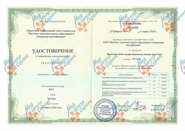 2024 г. | Повышение квалификации по программе «Первичная медико-профилактическая помощь населению». ООО «Институт дополнительного образования и повышения квалификации» |